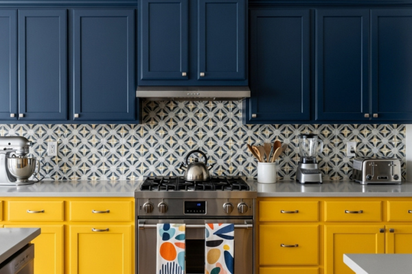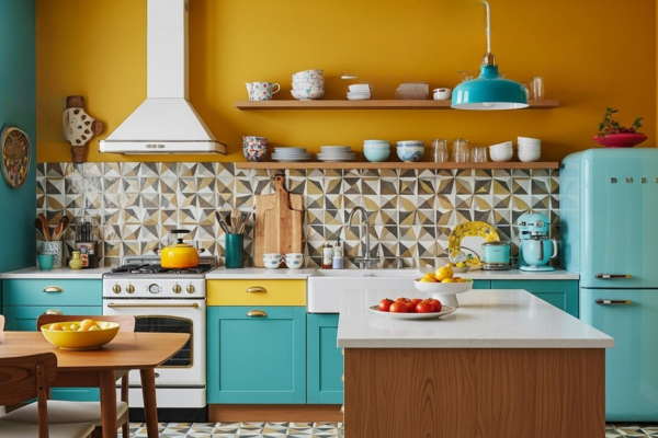 Combine eletrodomésticos coloridos, azulejos estampados e armários retrô com luminárias ou puxadores modernos. O mix de épocas cria contraste interessante.
