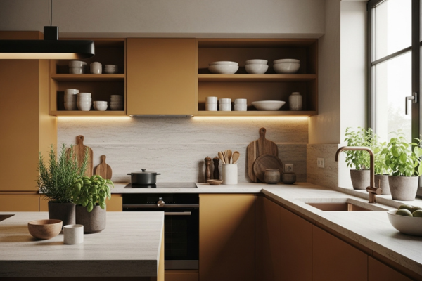 Mesmo sem grandes reformas, é possível aplicar Neuroarquitetura na Cozinha. Trocar a lâmpada por uma luz quente, incluir uma planta aromática ou reorganizar os utensílios já faz diferença.