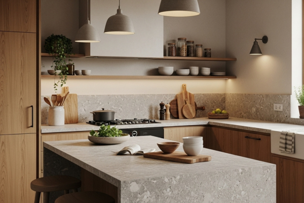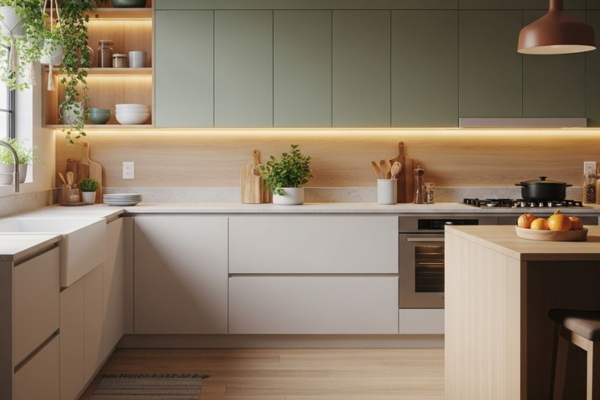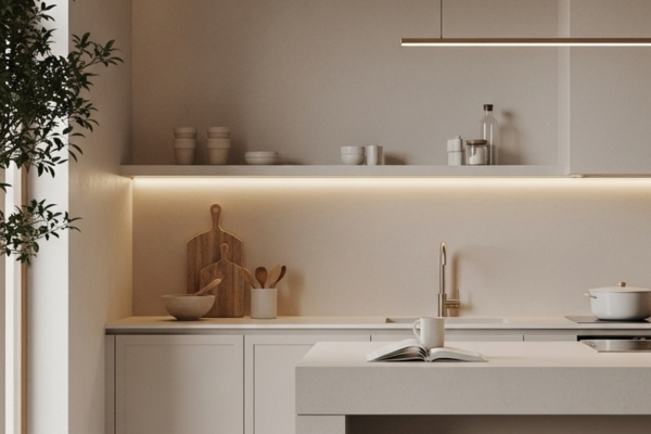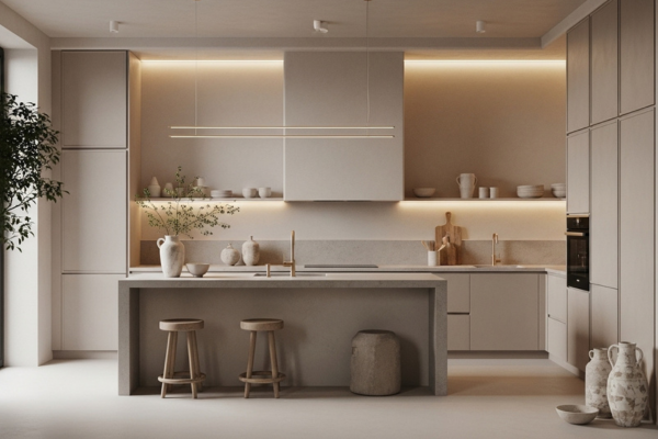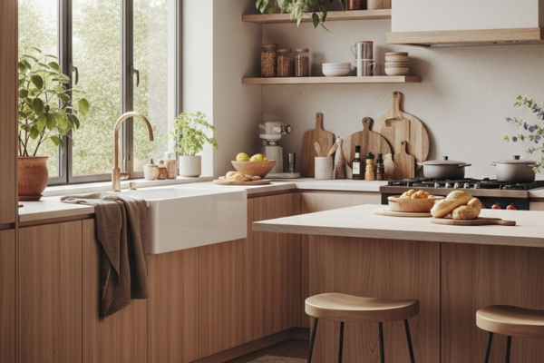 Toques suaves e texturas naturais, como o linho ou o bambu, melhoram a experiência tátil e tornam a cozinha mais convidativa.